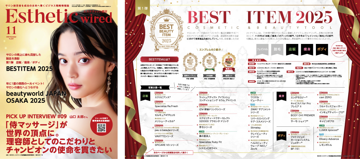 「ベストアイテム」は、全国のサロンオーナーを対象に調査を実施し、“1年を通してエステティックサロンの売上に最も貢献した”として多く名前が挙がった製品のみが称号を得ることができるエステティック通信主催のアワード企画です。