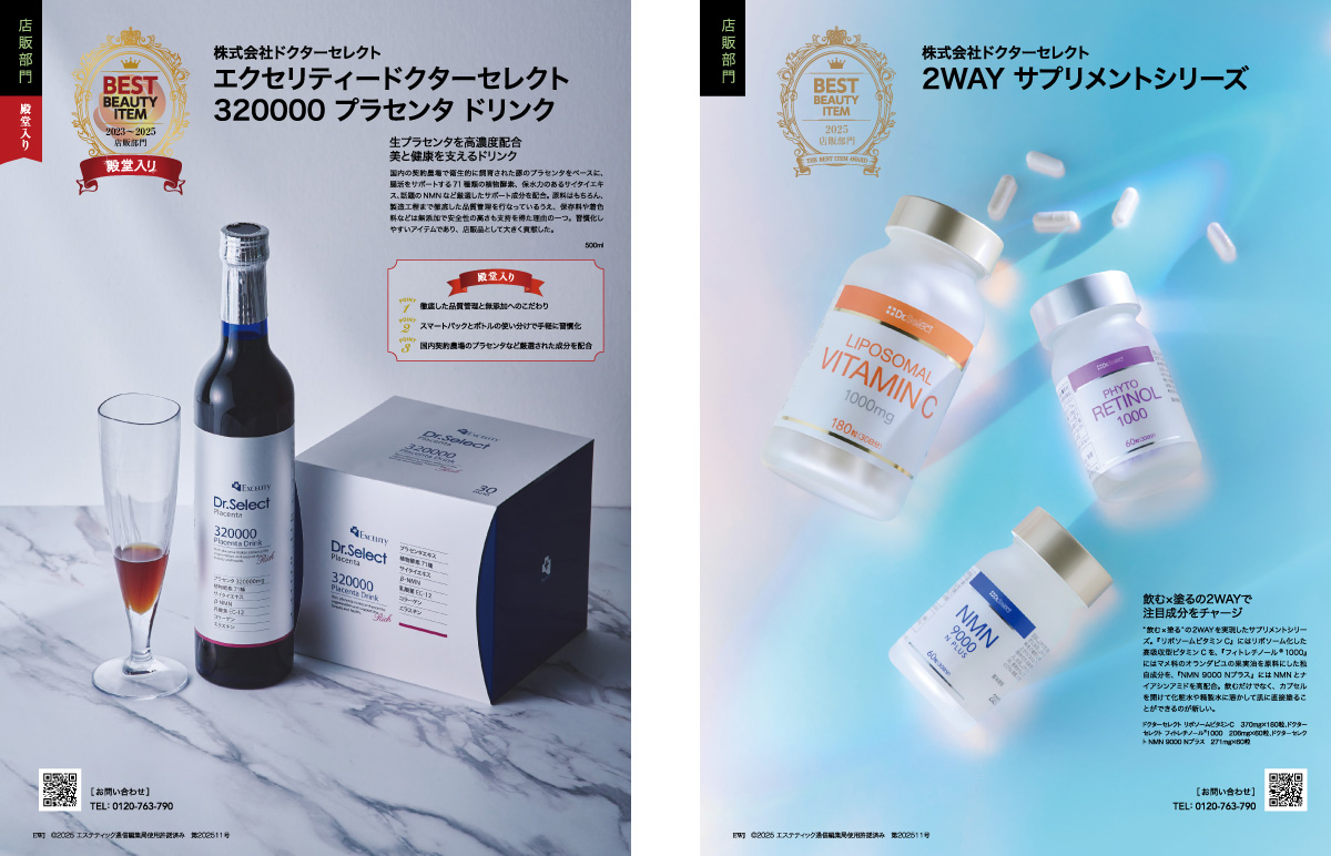 エステティック通信主催のアワード企画「BEST ITEM 2025」にて「エクセリティー ドクターセレクト320000 プラセンタ ドリンク 」が、「BEST BEAUTY ITEM 2025 店販部門」に殿堂入りしました。また、同企画にて「2WAY サプリメントシリーズ」が、同賞を受賞しました。