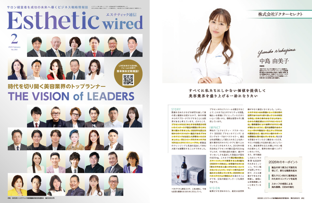 弊社取締役部長 中島 由美子が、エステティック通信(ESTHETIC WIRED) 2026年2月号「時代を切り開く美容業界のトップランナー THE VISION of LEADERS」に掲載されました。